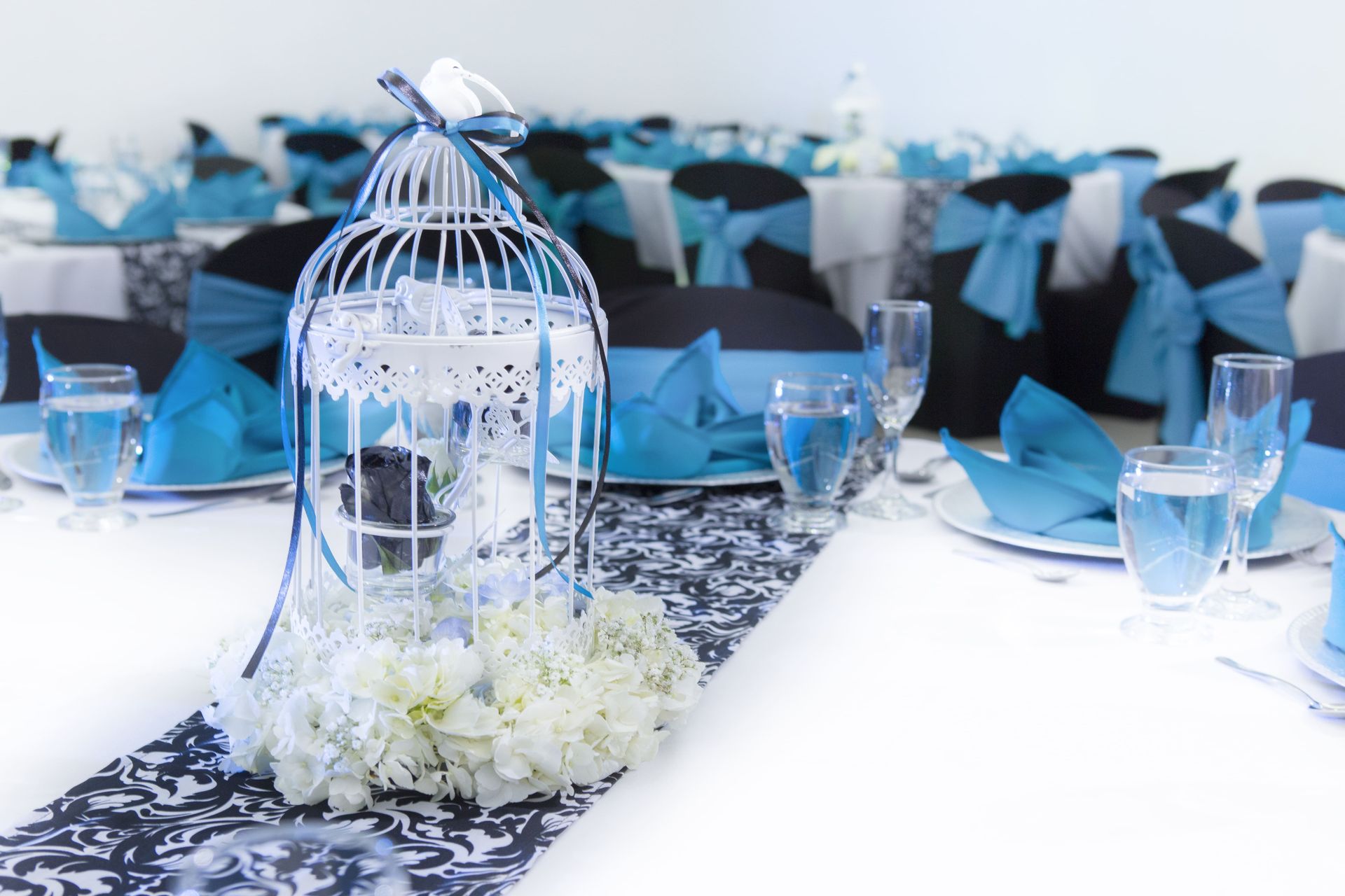 Las mesas se visten con manteles blancos que resaltan la pureza y permiten que los acentos de color destaquen con mayor intensidad. Las servilletas, dobladas de forma artística, lucen un turquesa profundo que se complementa con caminos de mesa en negro con patrones decorativos, creando un juego visual llamativo y elegante.
