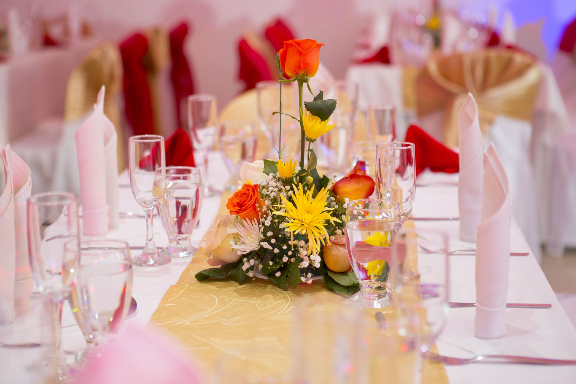 Este evento destaca por su ambiente cálido y sofisticado, donde la combinación de tonos rojo y dorado crea una atmósfera elegante y llena de vida. Cada mesa fue cuidadosamente decorada con caminos dorados, servilletas rojas y centros florales vibrantes que aportan un toque de frescura y belleza natural.