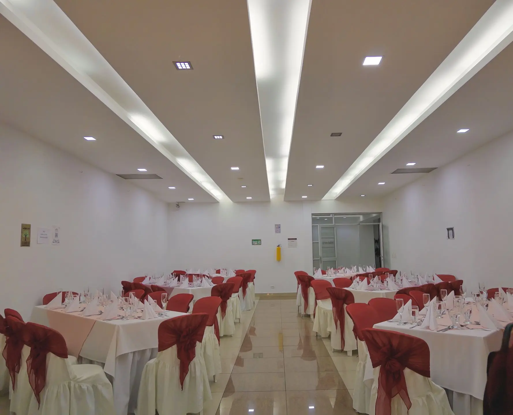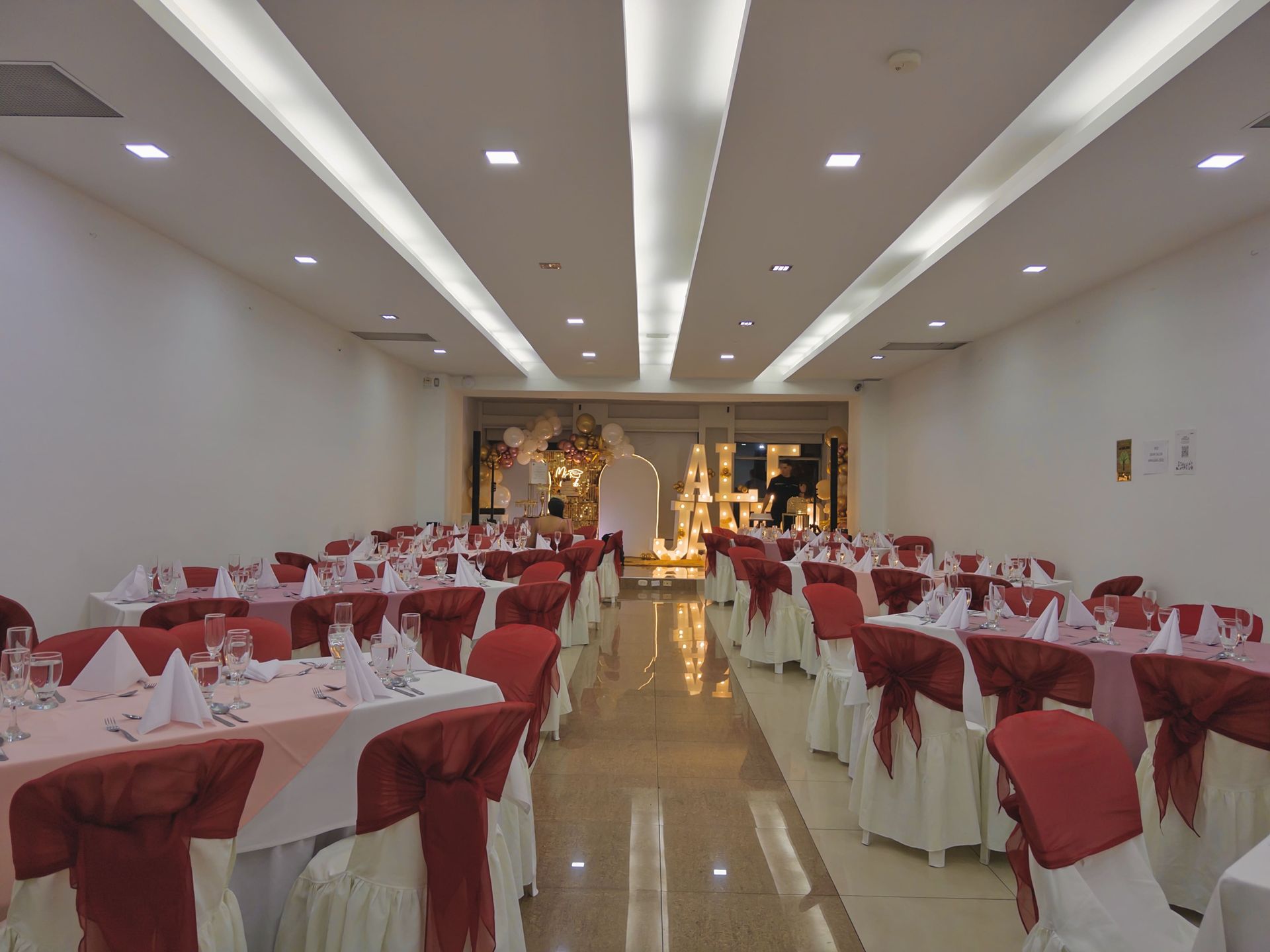 El Gran Salón del Hotel Galerías se transforma en un escenario de sofisticación y calidez bajo una propuesta decorativa que equilibra perfectamente la tradición y la modernidad. La paleta de colores está protagonizada por un rojo vino profundo, presente en los elegantes lazos de las sillas, que contrasta magistralmente con la pureza de los manteles blancos y los caminos de mesa en un delicado tono rosa pastel. Esta combinación cromática aporta una atmósfera de romance y distinción, ideal para celebraciones que buscan dejar una impresión memorable de elegancia clásica.