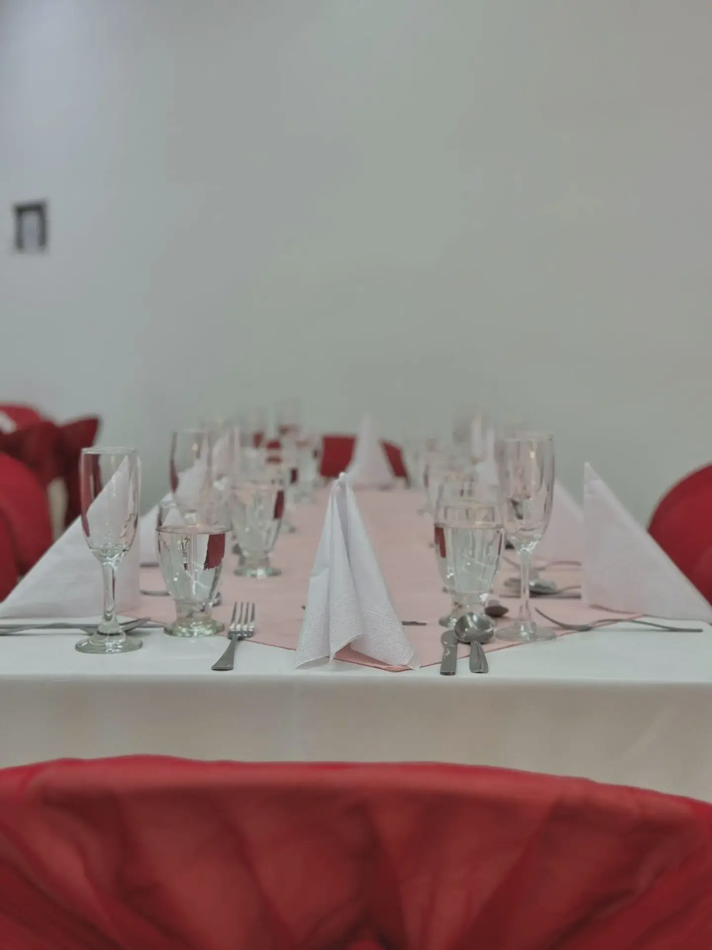 La meticulosa atención al detalle se refleja en la impecable disposición de la mesa, donde la cristalería brillante y la cubertería de alta calidad captan los destellos de la iluminación cenital. El montaje destaca por la simetría de sus servilletas en punta y la transparencia de las copas, elementos que proyectan orden y profesionalismo. Cada lugar ha sido diseñado para ofrecer una experiencia visual limpia y lujosa, demostrando que la excelencia de nuestro servicio reside en el cuidado de los pequeños elementos que componen la gran escena.